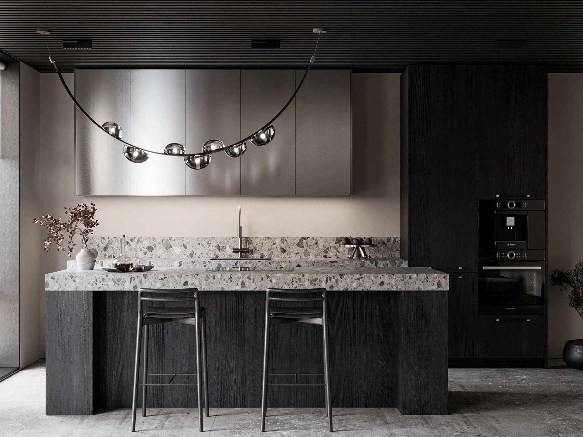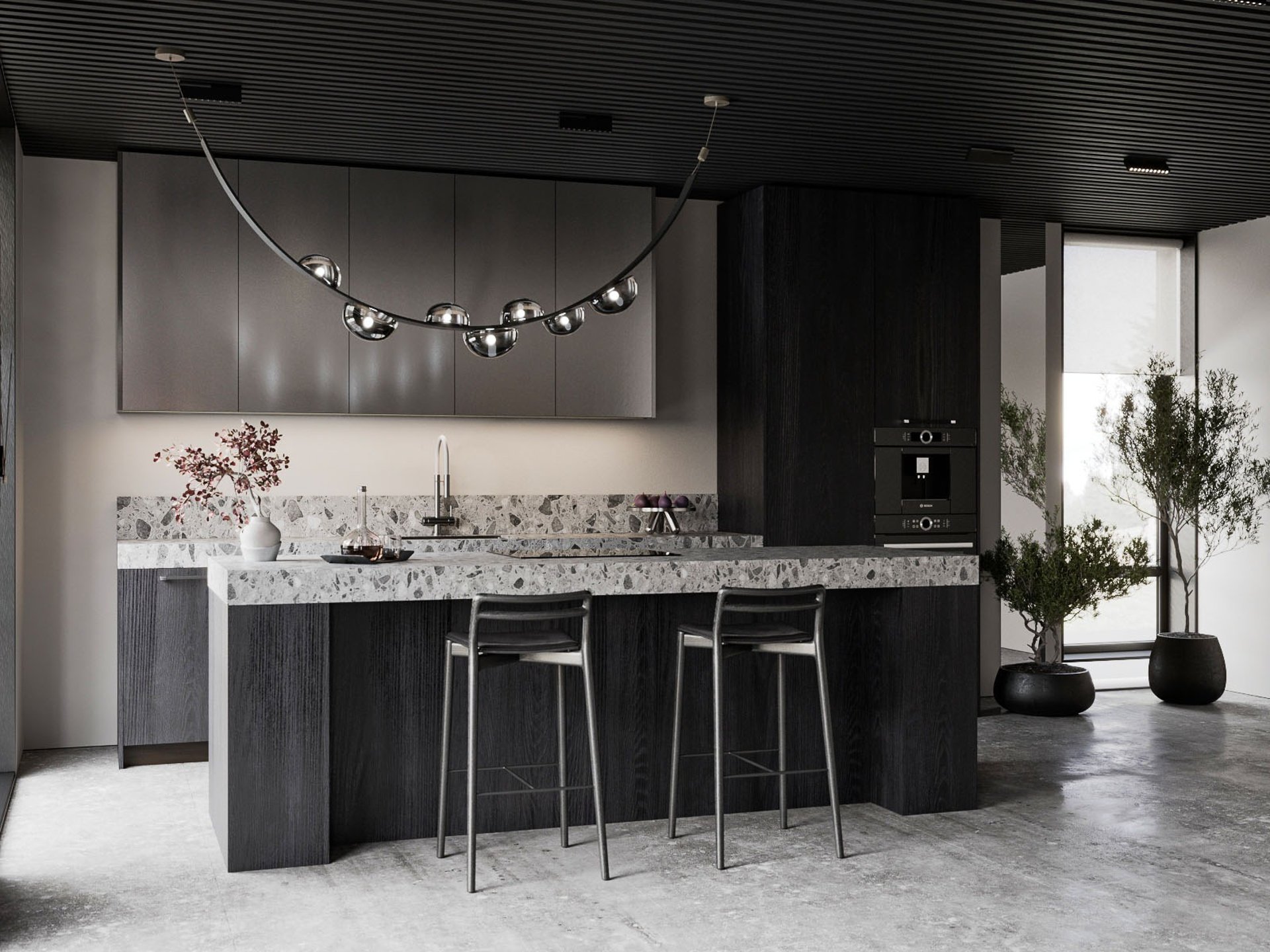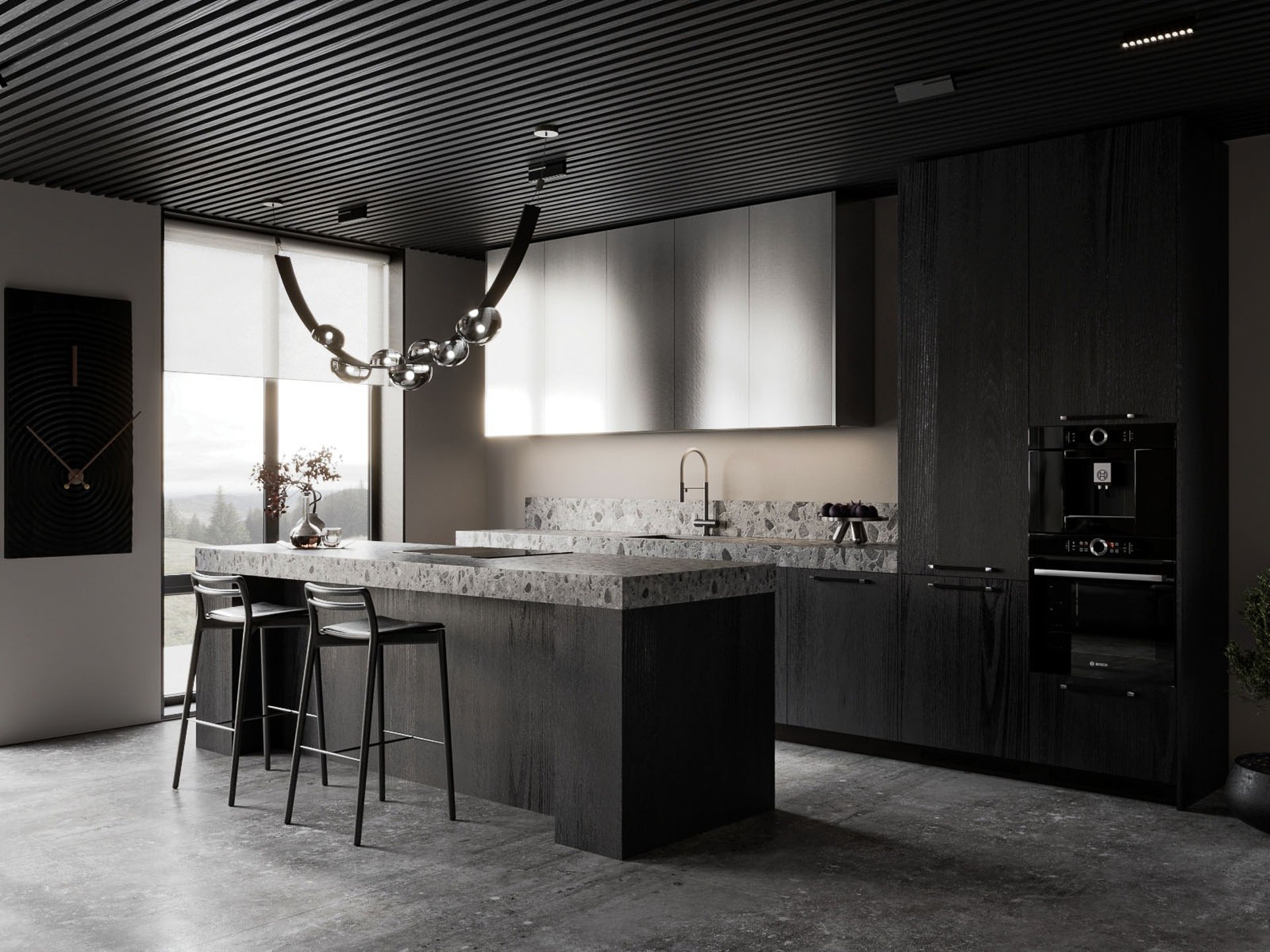 Moderne Küche im Industrial-Stil – eine kraftvolle Kombination aus dunklem Holz, gebürstetem Metall und Stein.